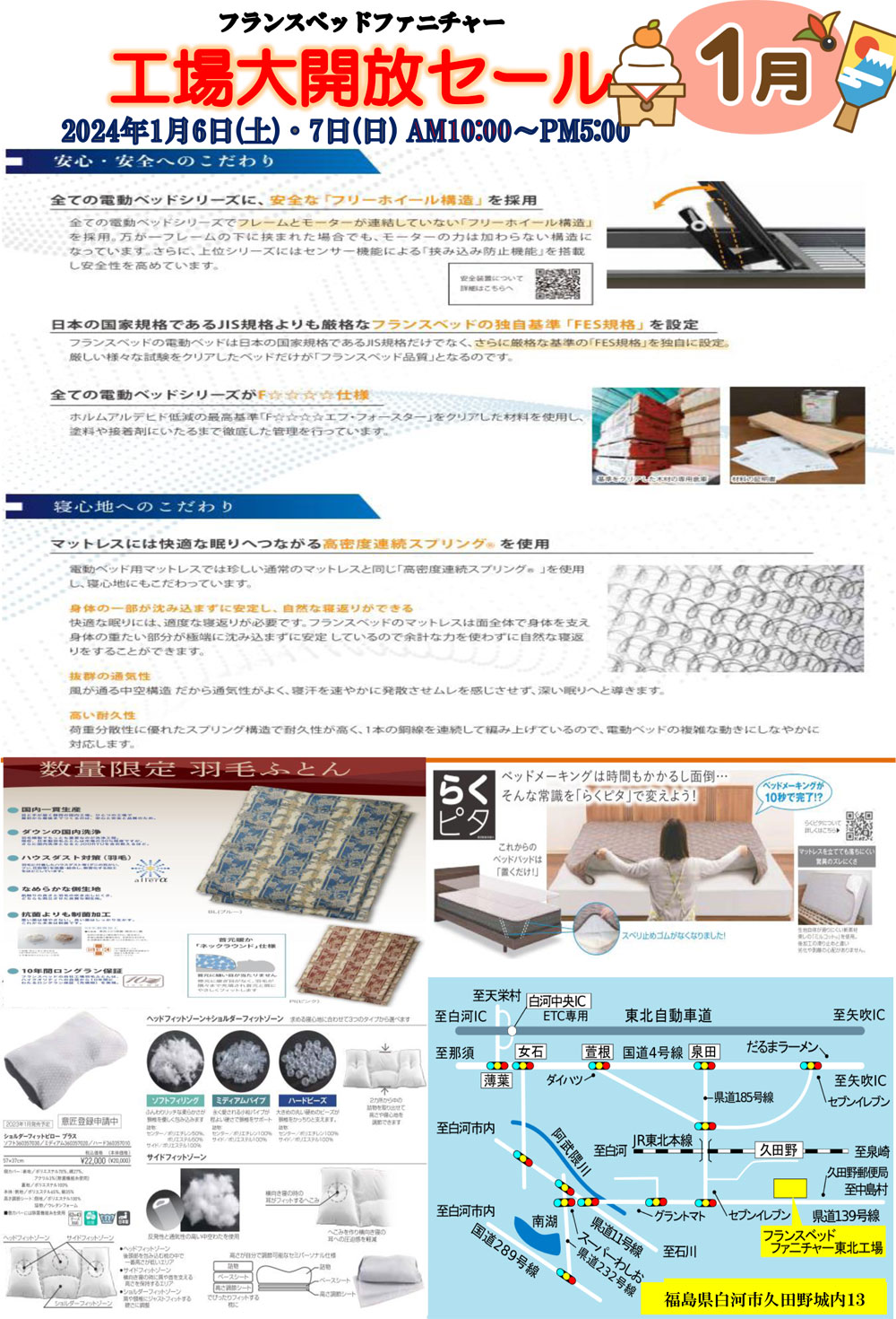 フランスベッド工場大開放スペシャルセール! 新作、展示現品も全商品、工場特別価格にてご提供! |