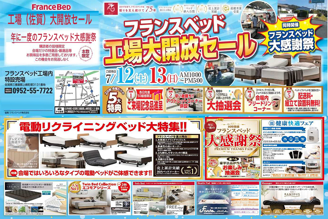 フランスベッド工場大開放スペシャルセール! 新作、展示現品も全商品、工場特別価格にてご提供! |
