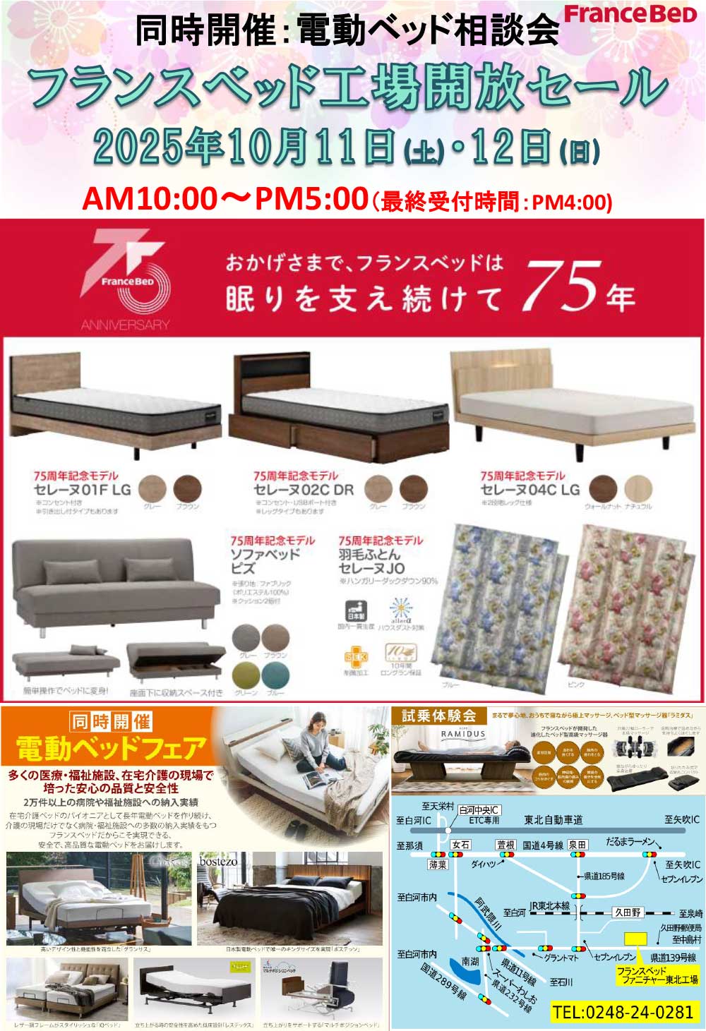 フランスベッド工場大開放スペシャルセール! 新作、展示現品も全商品、工場特別価格にてご提供! |