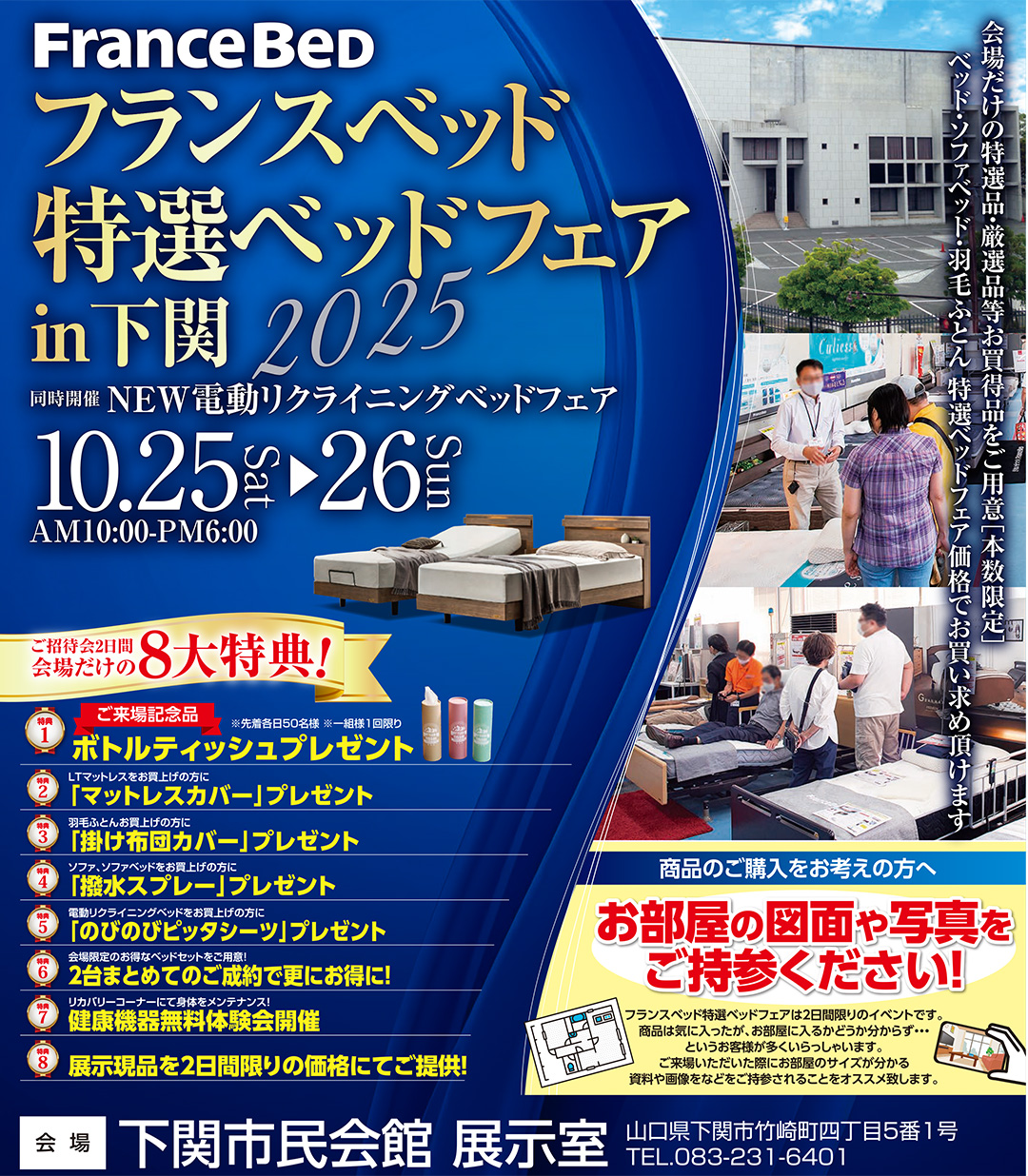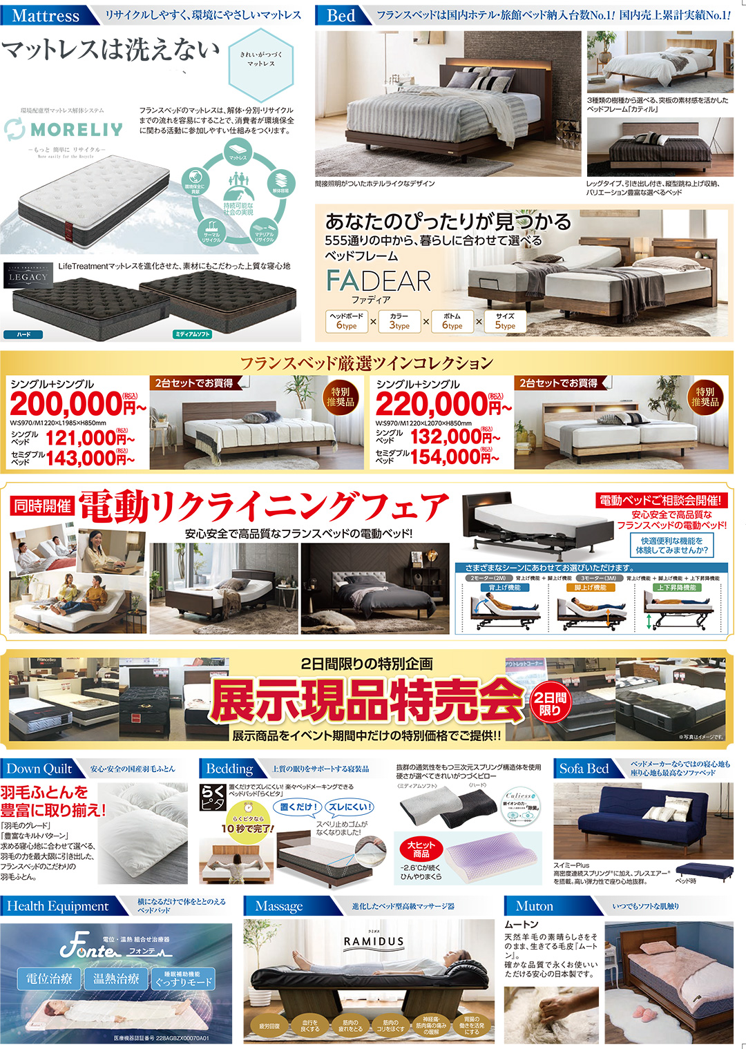 フランスベッド工場直送スペシャルフェア! 新作、展示現品も全商品、工場直送フェア特別価格にてご提供! |