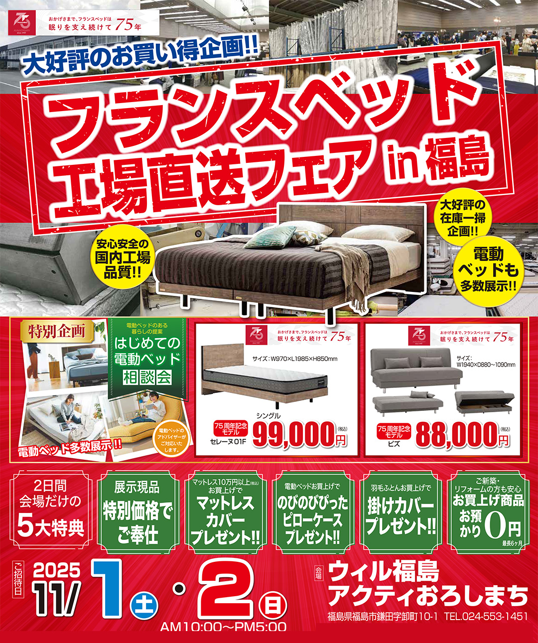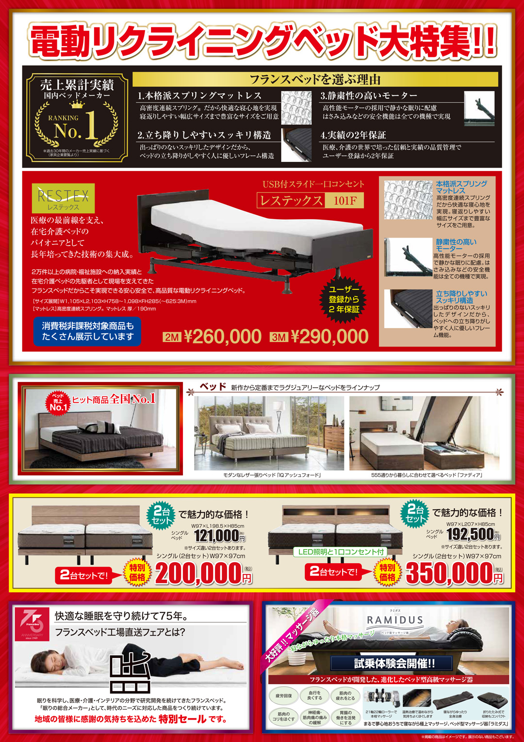 フランスベッド工場直送スペシャルフェア! 新作、展示現品も全商品、工場直送フェア特別価格にてご提供! |