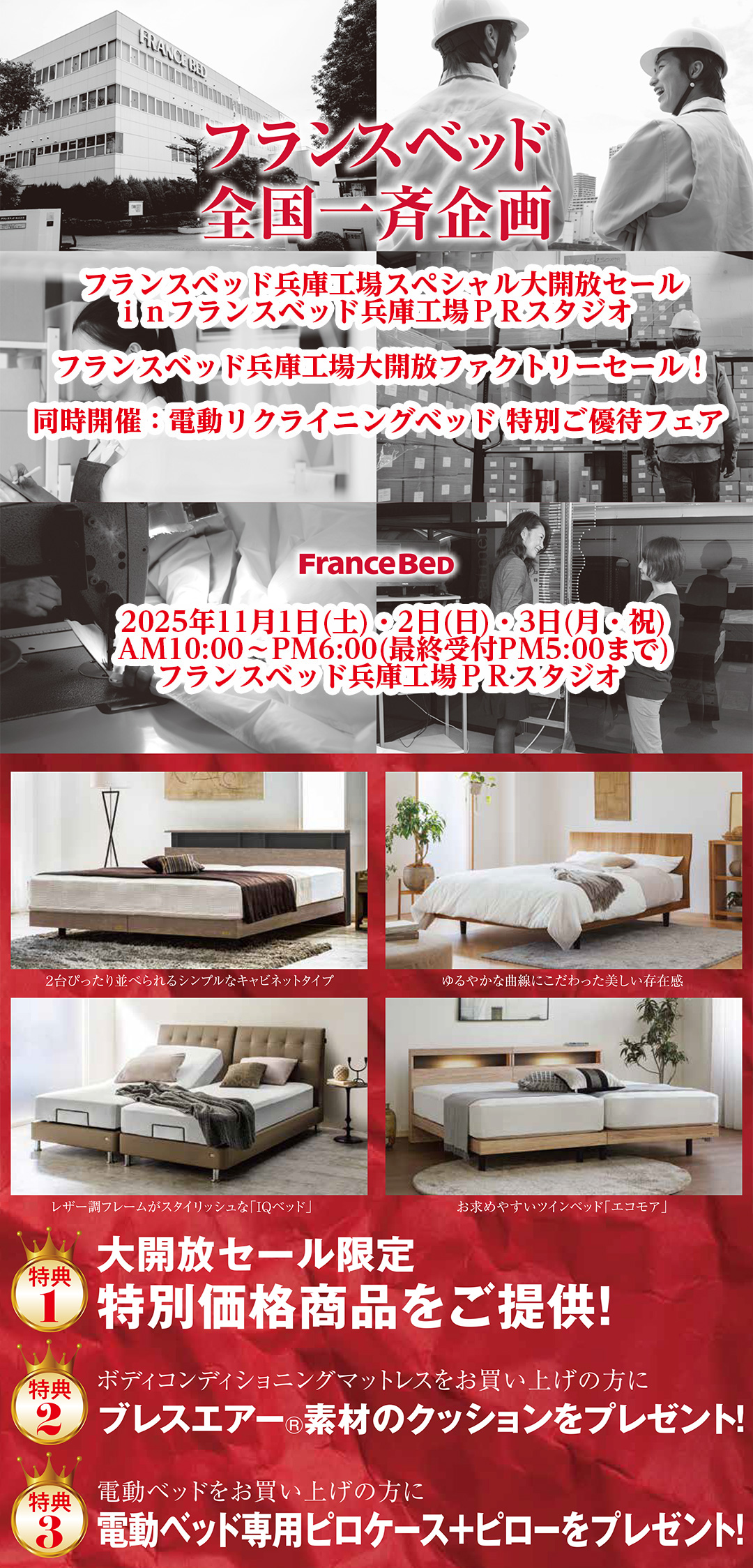 フランスベッド兵庫工場大開放・全館全品特別セール! 新作、展示現品も全商品、限定特別価格にて特別ご提供! |