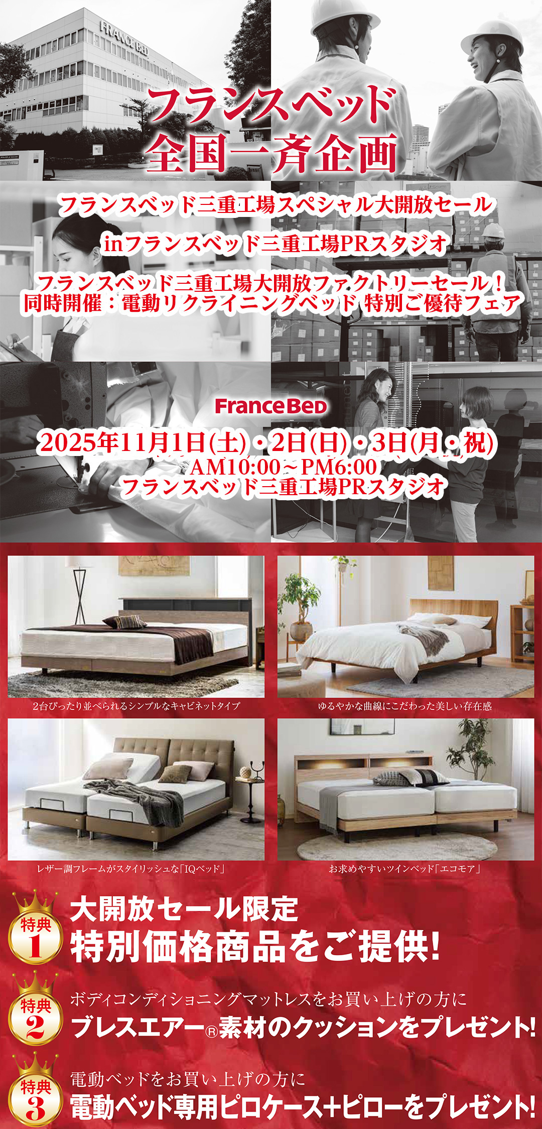 フランスベッド三重工場大開放! 新作、展示現品も全商品、特別ご優待にてご提供! |
