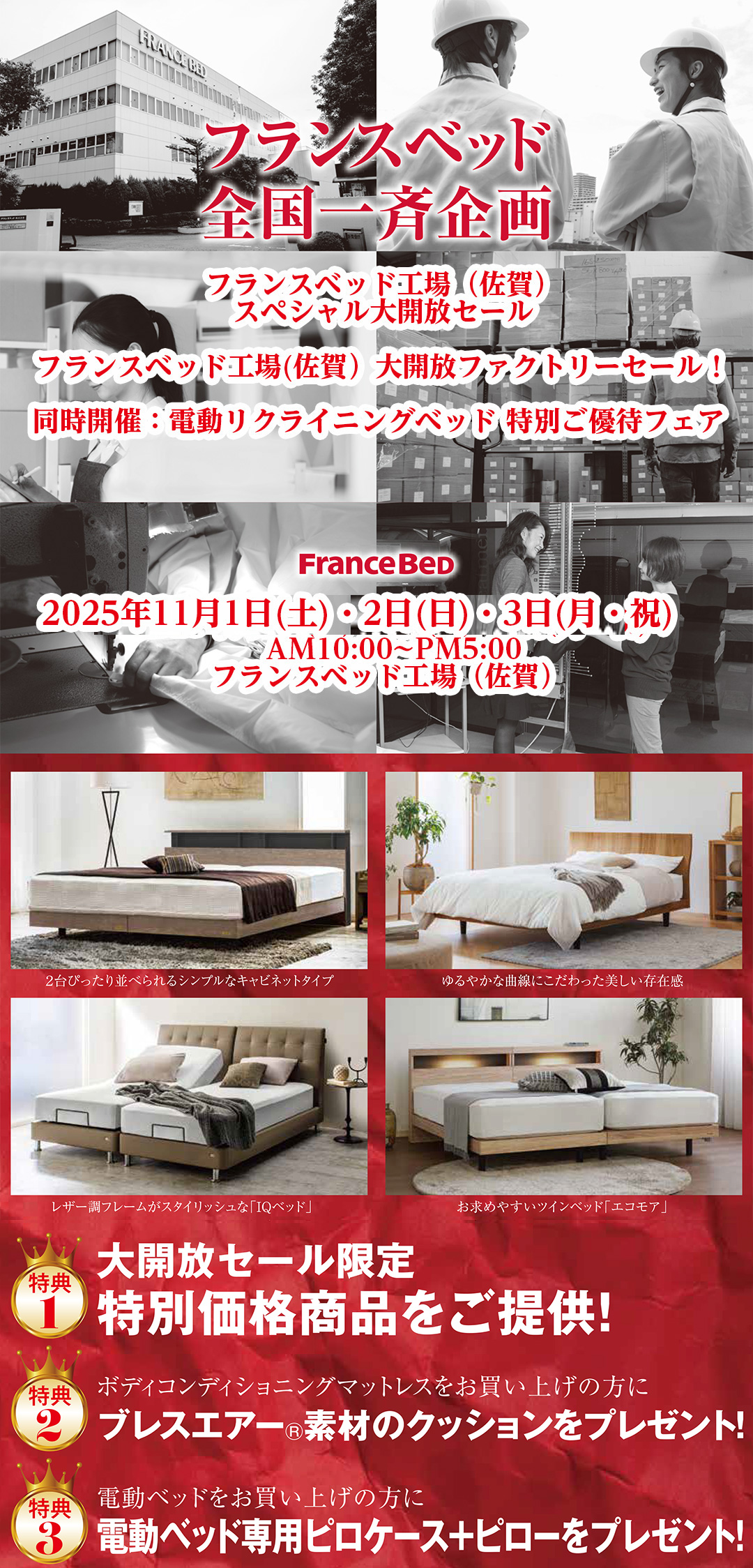 フランスベッド工場大開放スペシャルセール! 新作、展示現品も全商品、工場特別価格にてご提供! |