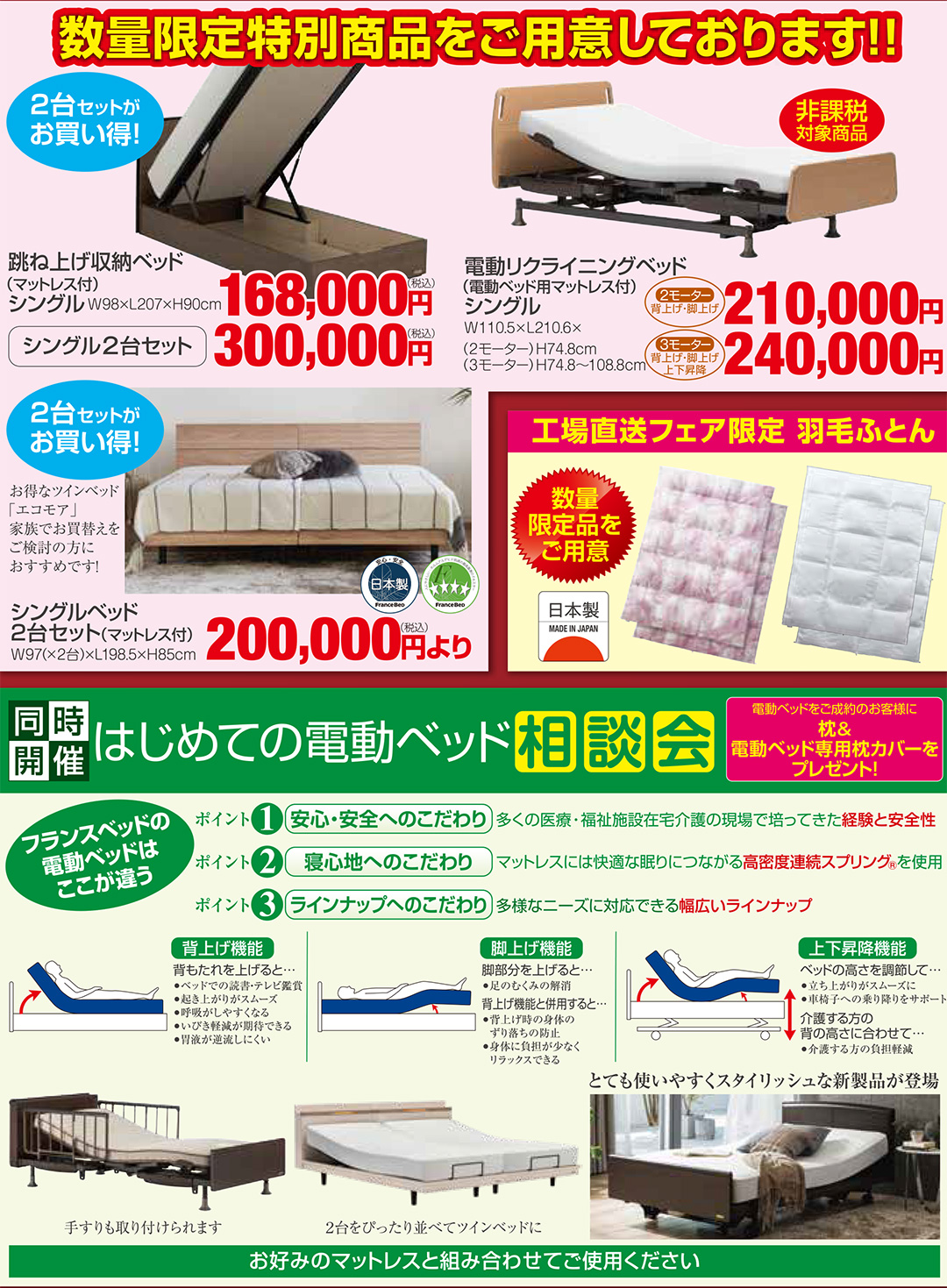 フランスベッド工場直送スペシャルフェア! 新作、展示現品も全商品、工場直送フェア特別価格にてご提供! |