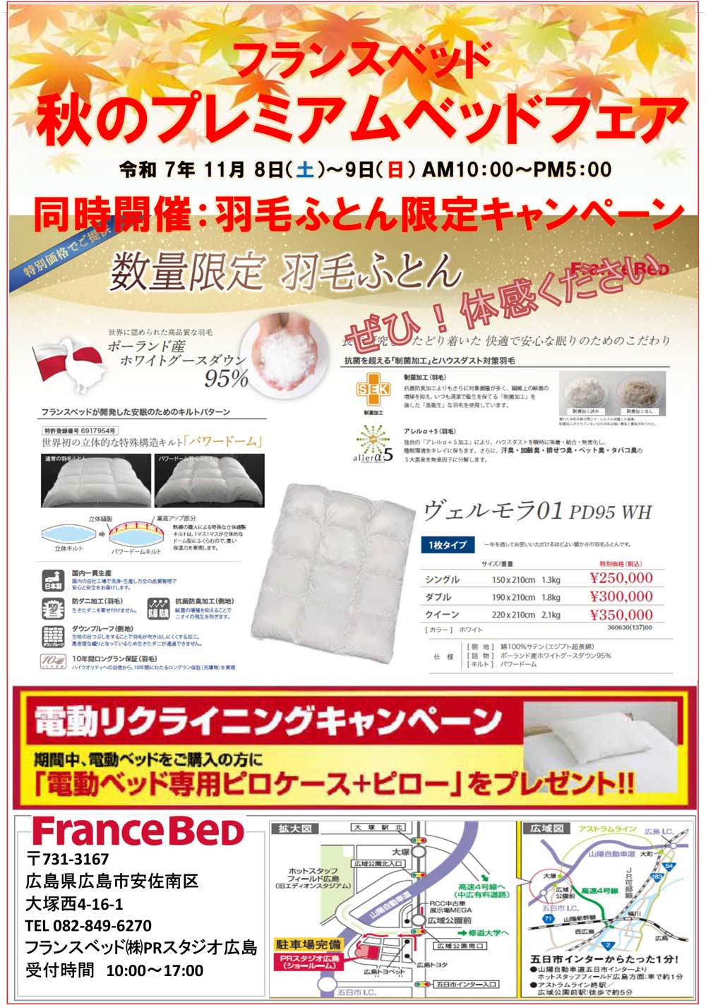 | 開催会場 | フランスベッド広島PRスタジオ (広島で唯一のフランスベッドショールーム、プレゼンテーションスタジオでございます) |