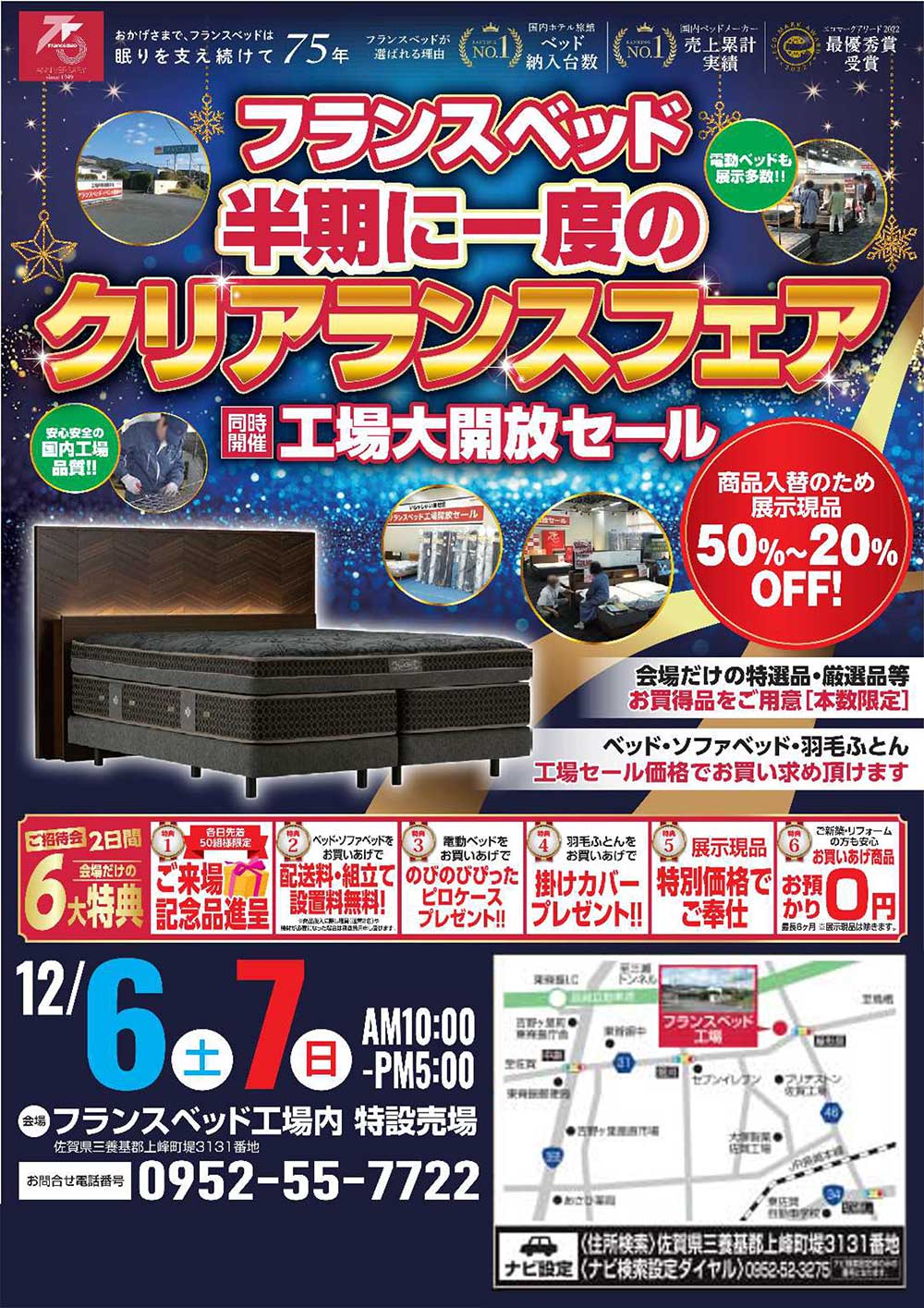 | 開催住所 | 〒849-0124 佐賀県三養基郡上峰町堤3131 フランスベッド工場 会場電話番号:0952-55-7722(開催期間中のみ) お問い合わせ 担当 増山 090-4982-5597 |