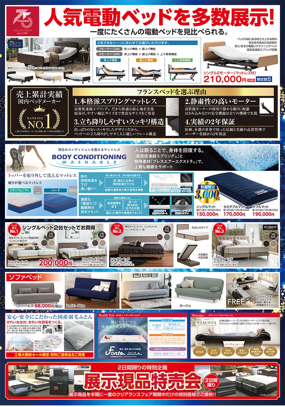 フランスベッド工場大開放スペシャルセール! 新作、展示現品も全商品、工場特別価格にてご提供! |