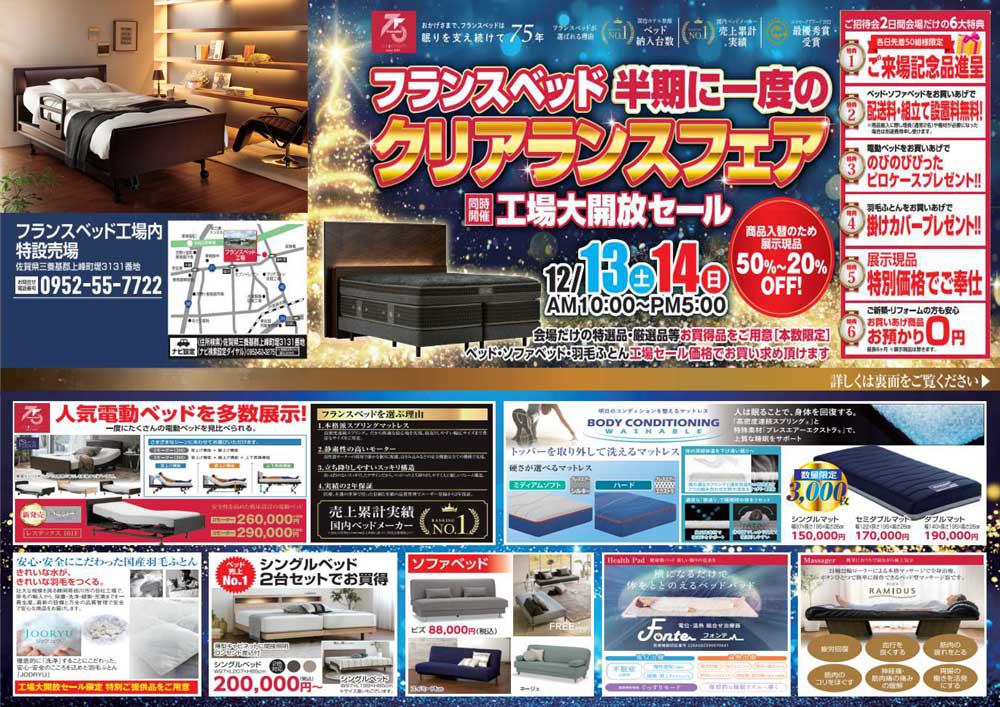 フランスベッド工場大開放スペシャルセール! 新作、展示現品も全商品、工場特別価格にてご提供! |