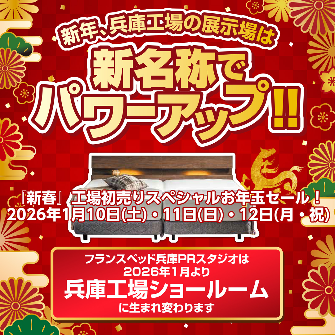 フランスベッド兵庫工場大開放・全館全品特別セール! 新作、展示現品も全商品、限定特別価格にて特別ご提供! |