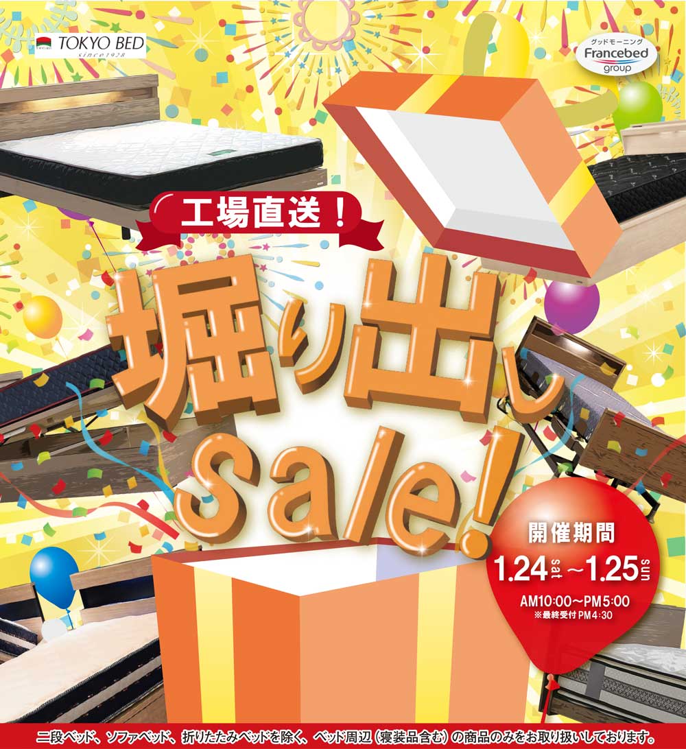 高品質ベッドを、東京ベッドの工場バーゲン特別イベントならではの大特価でご提供! 展示品が無くてもご優待価格でご案内! |