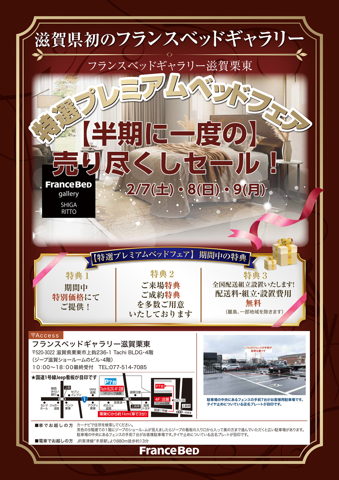 フランスベッドギャラリー滋賀栗東グランドオープンスペシャルフェア! 新作、展示現品も全商品、アウトレット特別価格にてご提供! |