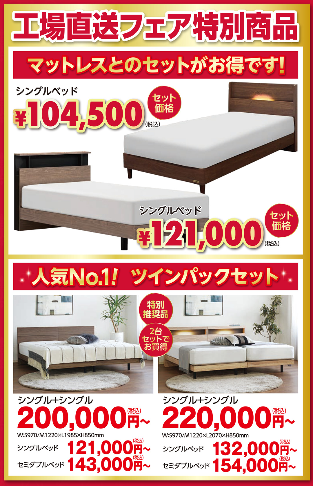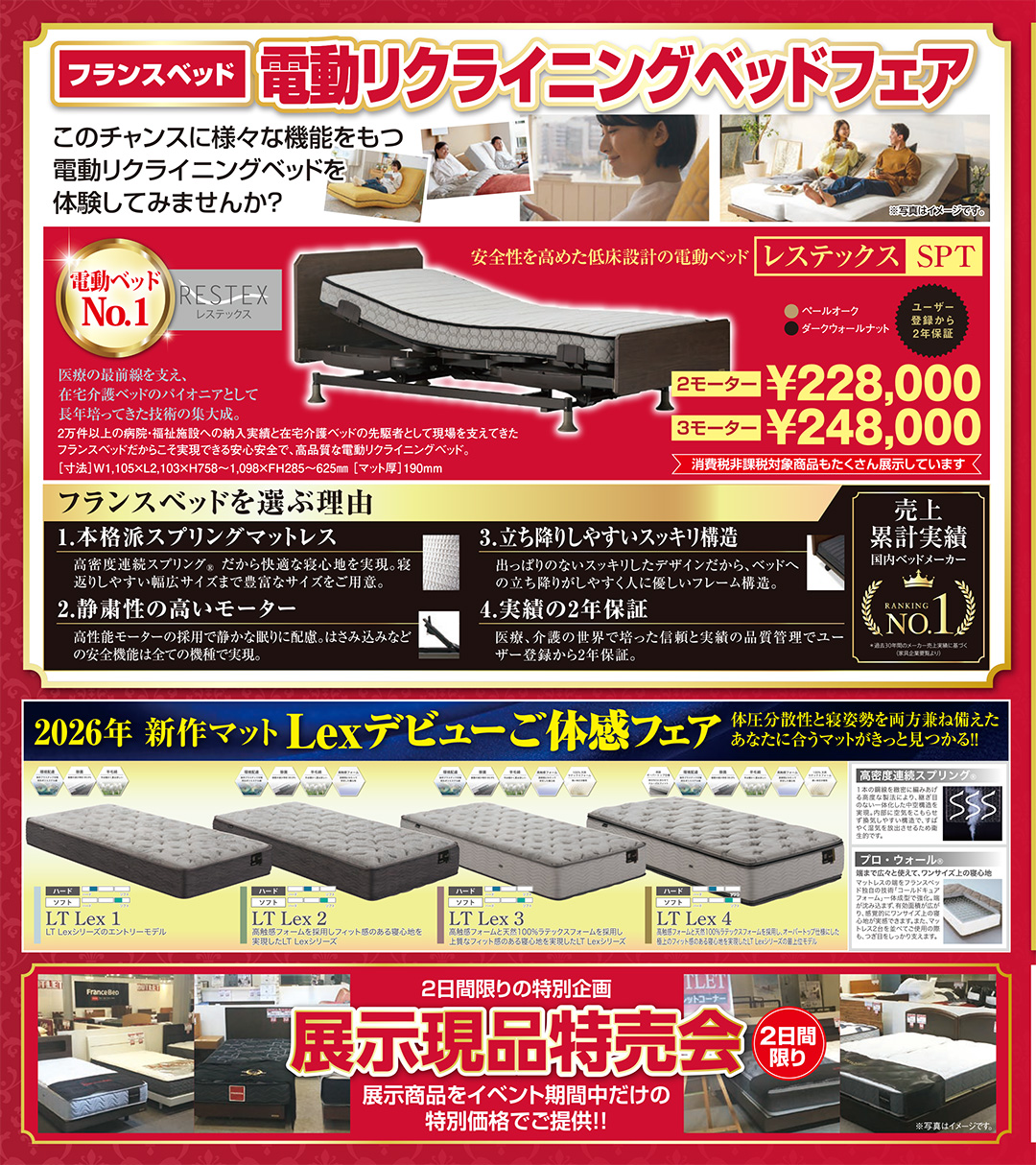 フランスベッド工場直送スペシャルフェア! 新作、展示現品も全商品、工場直送フェア特別価格にてご提供! |