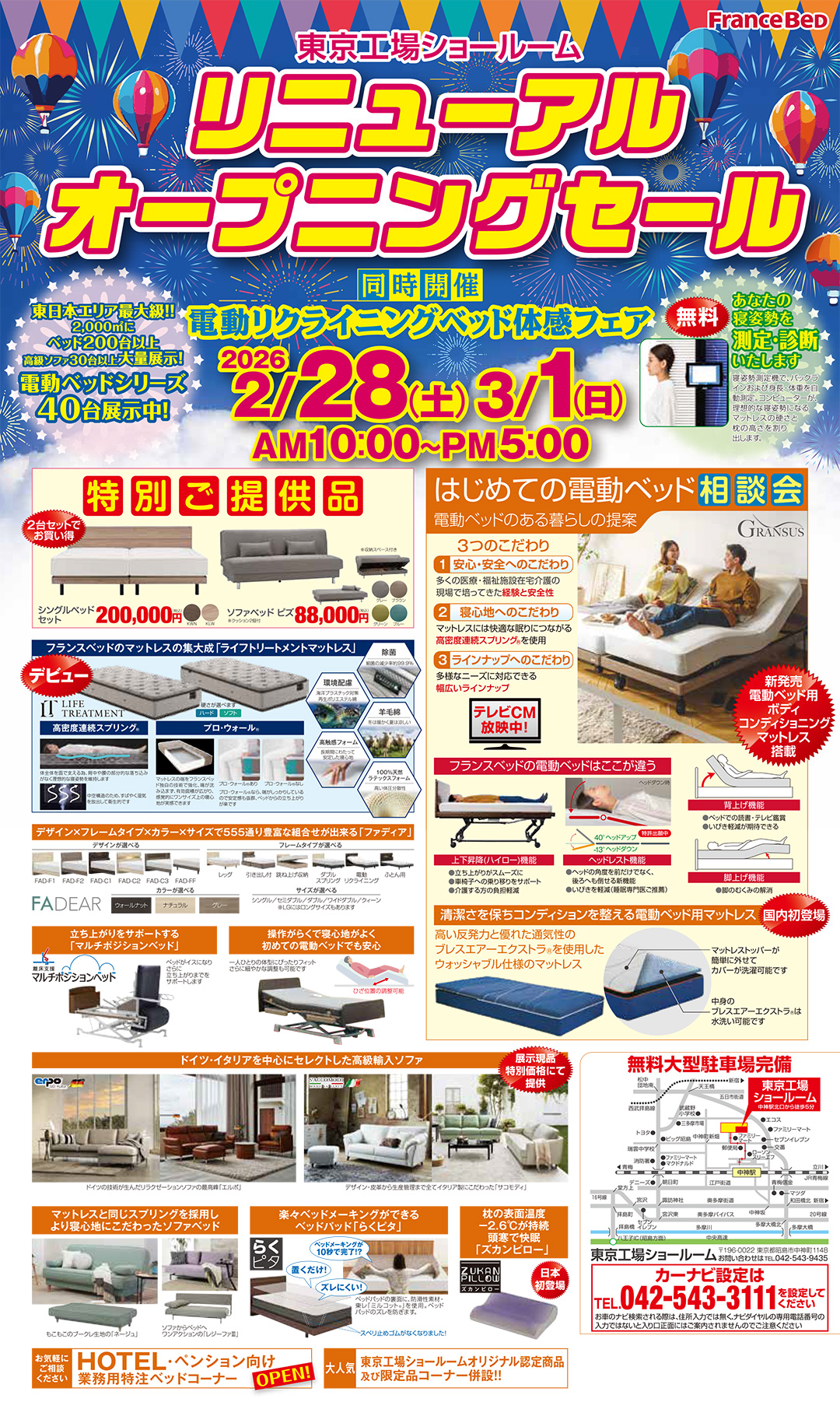 | 交通 | ■電車でお越しの場合 JR青梅線「中神駅」北口より徒歩5分 ※JR中央線「新宿駅」より「中神駅」まで青梅特快で約30分! ■お車でお越しの場合 中央高速 八王子IC下車、約20分 ※カーナビには、TEL042-543-3111「フランスベッド東京工場」と設定をお願いいたします。 |