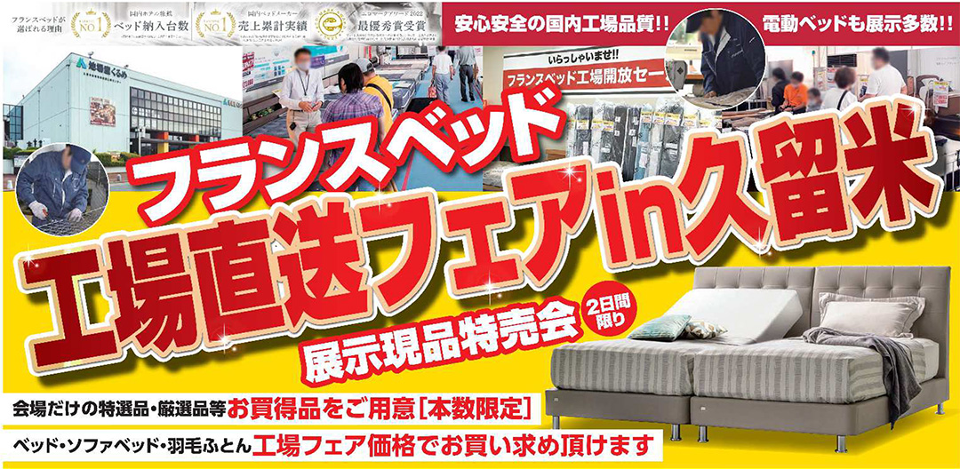 フランスベッド工場直送スペシャルフェア! 新作、展示現品も全商品、工場直送フェア特別価格にてご提供! |