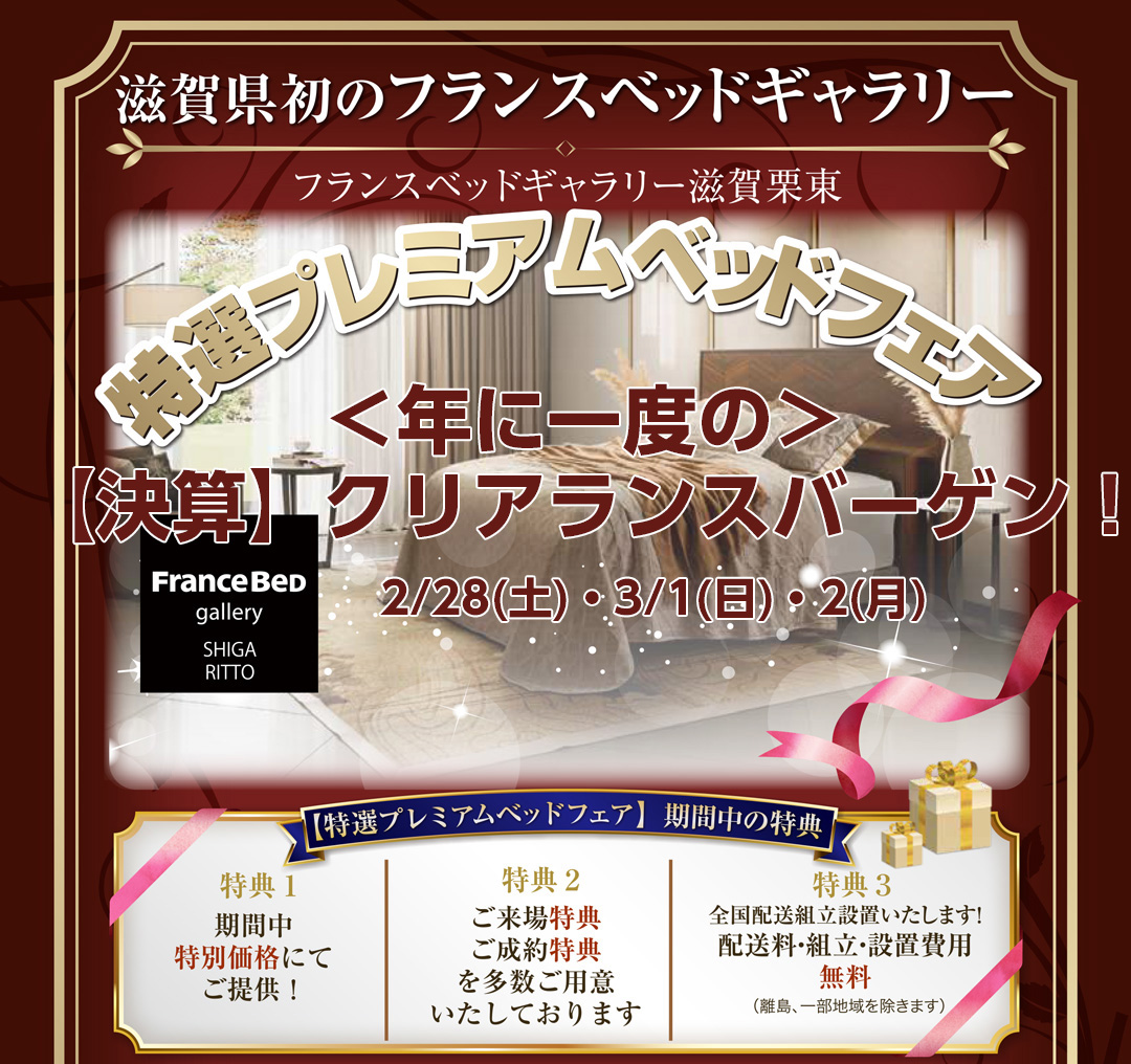 フランスベッドギャラリー滋賀栗東グランドオープンスペシャルフェア! 新作、展示現品も全商品、アウトレット特別価格にてご提供! |
