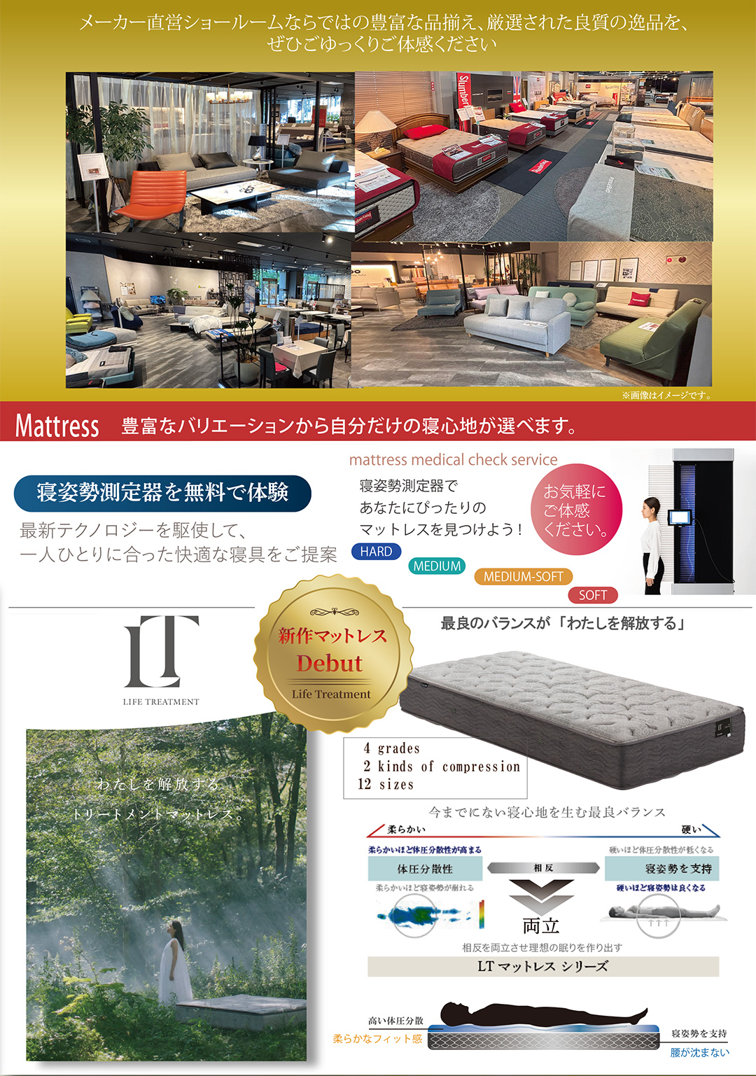 フランスベッドの集大成「ライフトリートメントマットレス」も、たいへんお得に出品、展示! 存分にご体感いただけます! 身体を面全体で受け止めるから寝返りしやすく、通気性も抜群! 眠りの質を高めるフランスベッドの高密度連続スプリングマットレス! |