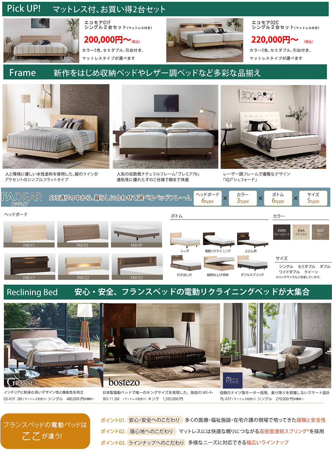 デザイン×脚周り×サイズで、555通りの豊富な組合せが出来るベッド「ファディア」も、たいへんお得に出品展示!ご体感も存分にしていただけます! |