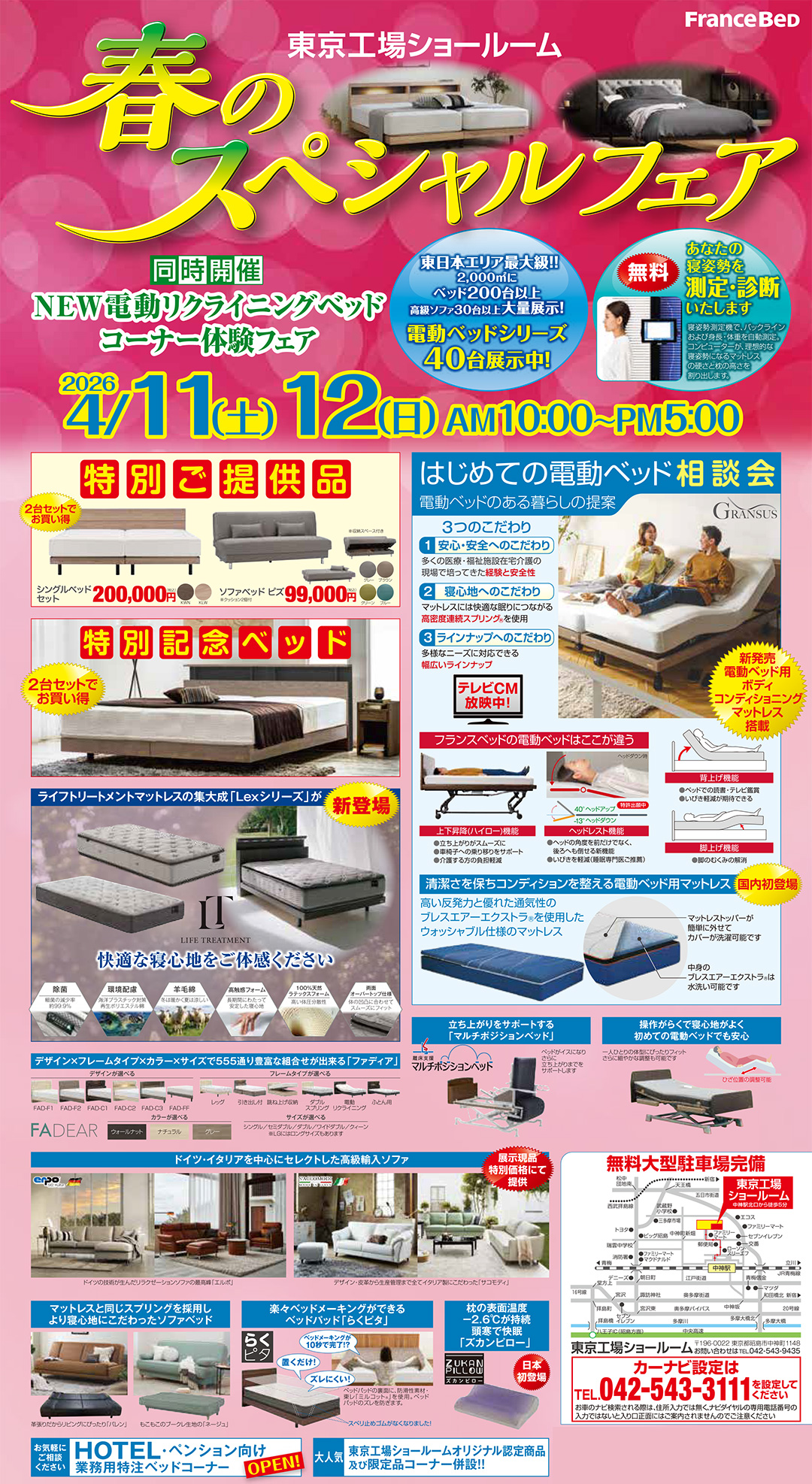 「電動リクライニングベッドご優待フェア特別開催!デザイン性と機能性を両立した『グランサス』新登場!寝心地など存分にお試しいただけます!」 |