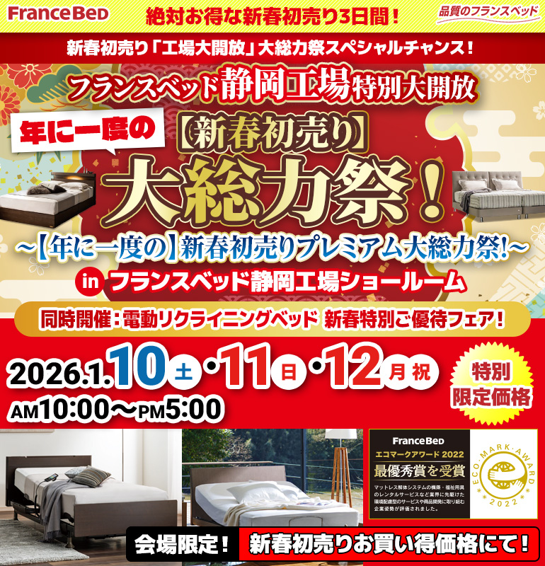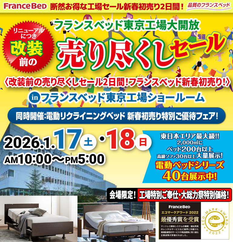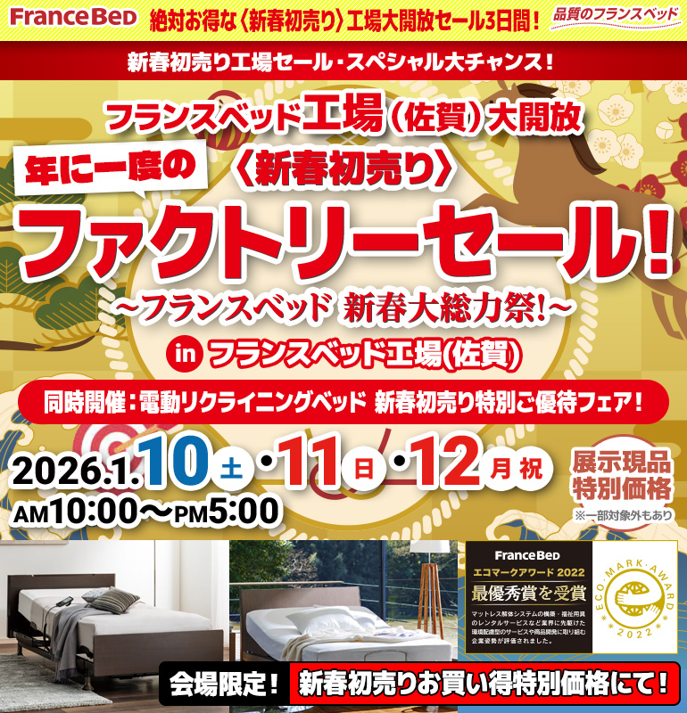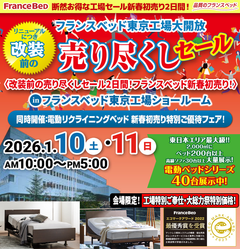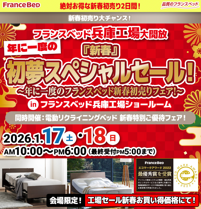 - <年に一度のフランスベッド新春初売りフェア!> フランスベッド兵庫工場大開放 『新春』初夢スペシャルセール!