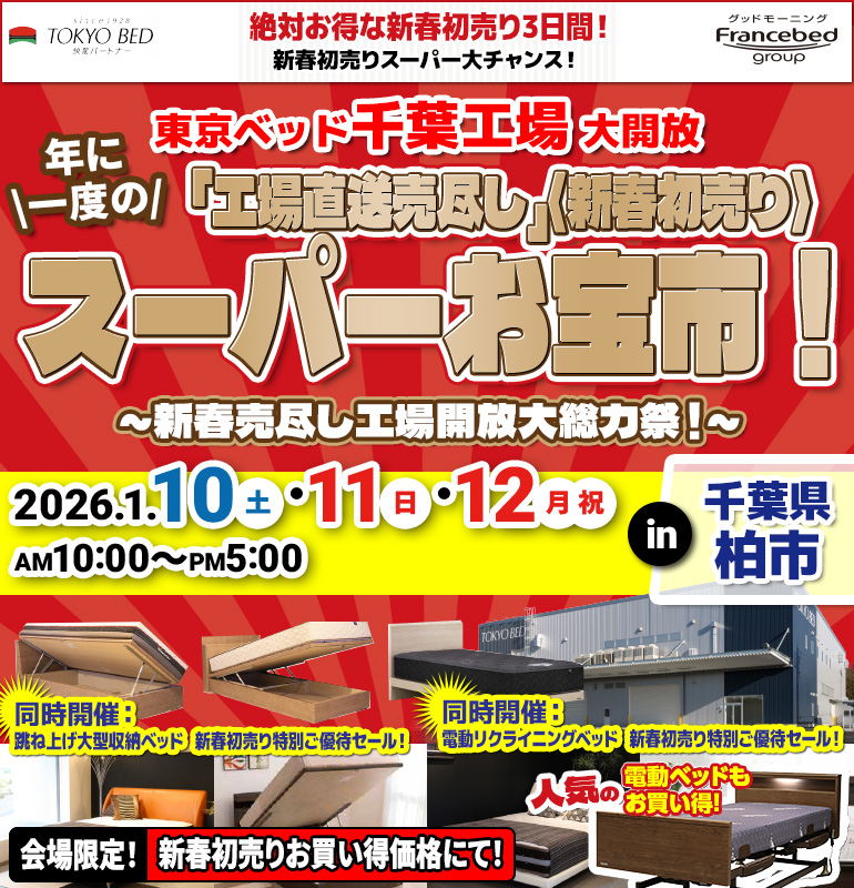 - <年に一度の> 東京ベッド千葉工場大開放市 「工場直送売尽し」<新春初売り>スーパーお宝市!