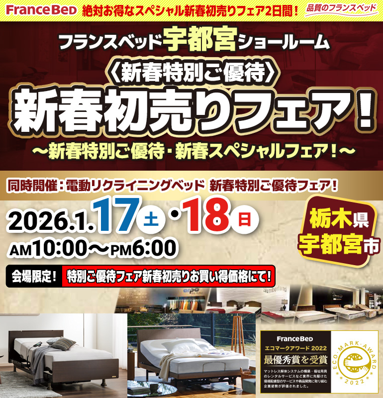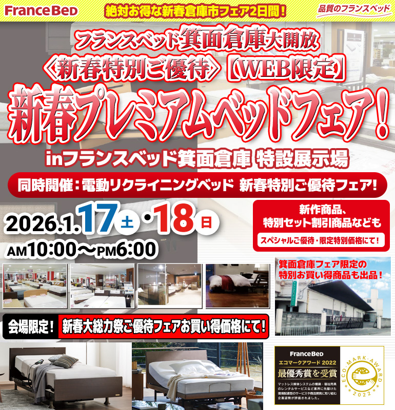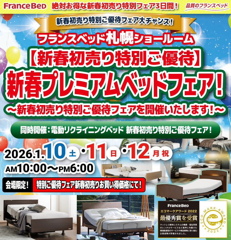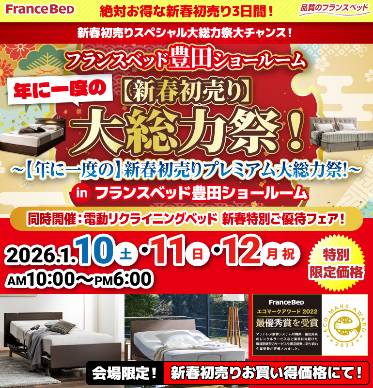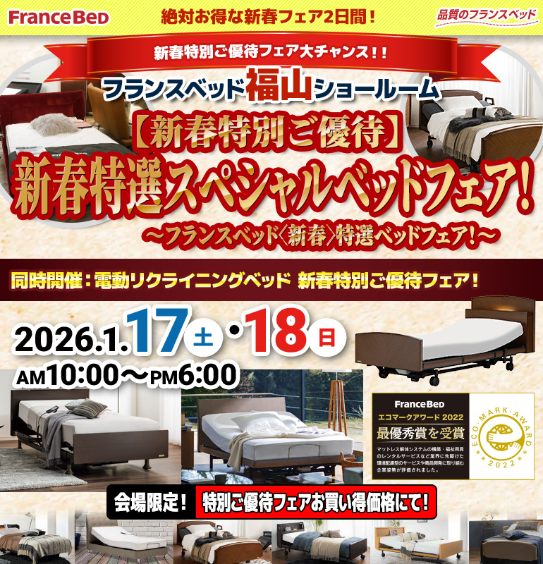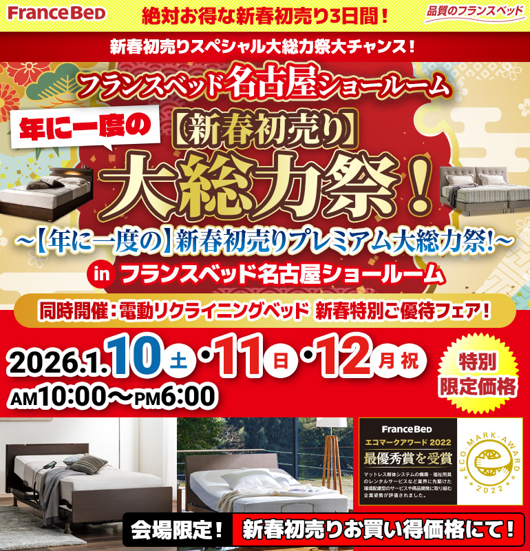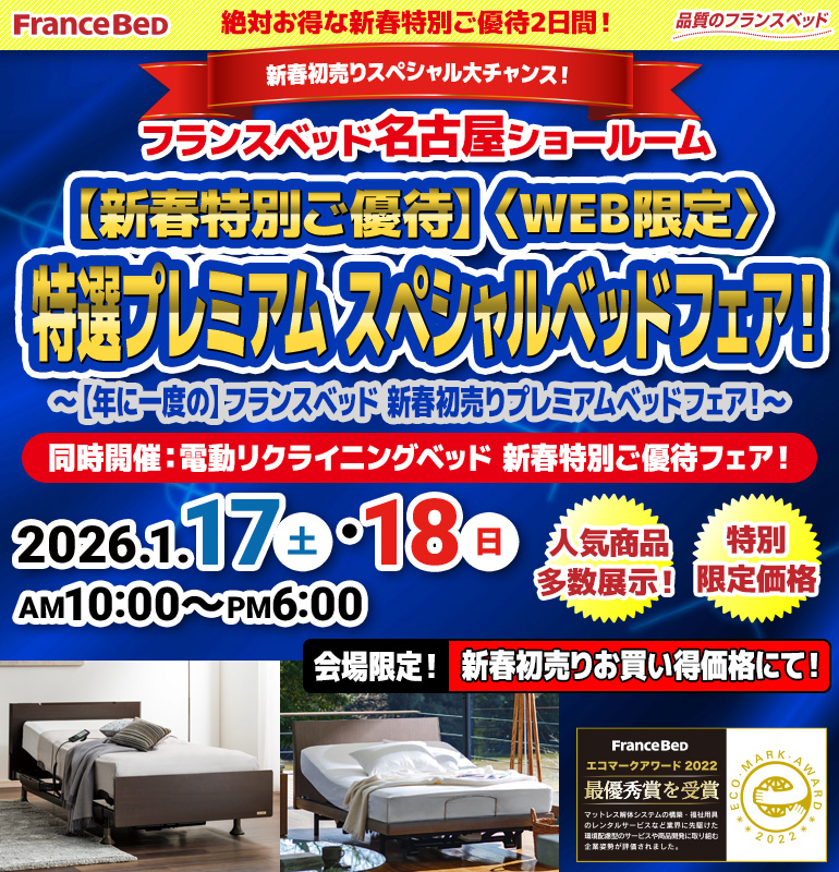 - フランスベッド名古屋ショールーム【新春特別ご優待】 <WEB限定>特選プレミアム スペシャルベッドフェア!