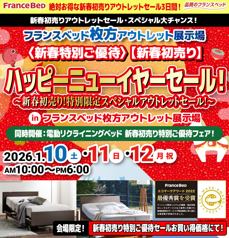 - フランスベッド枚方アウトレット展示場 <新春特別ご優待>【新春初売り】ハッピーニューイヤーセール!