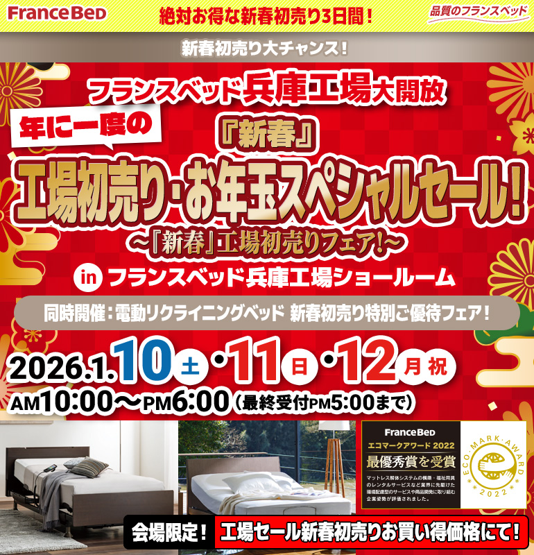 - <年に一度のフランスベッド新春初売りフェア!> フランスベッド兵庫工場大開放 『新春』工場初売り・お年玉スペシャルセール!