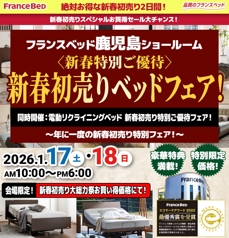 - <年に一度の新春初売り特別フェア!> フランスベッド鹿児島ショールーム<新春特別ご優待>新春初売りベッドフェア!