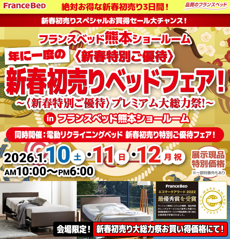 - <年に一度の新春初売り特別フェア!> フランスベッド熊本ショールーム<新春特別ご優待>新春初売りベッドフェア!