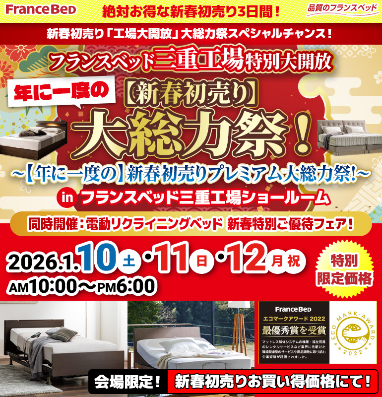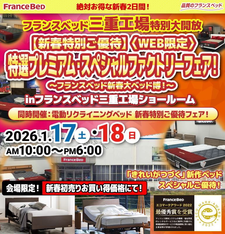 - フランスベッド三重工場特別大開放 【新春特別ご優待】 <WEB限定>特選プレミアム・スペシャルファクトリーフェア!