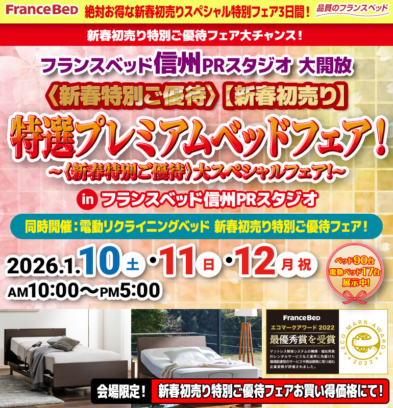 - フランスベッド信州PRスタジオ 大開放 <新春特別ご優待>【新春初売り】特選プレミアムベッドフェア!