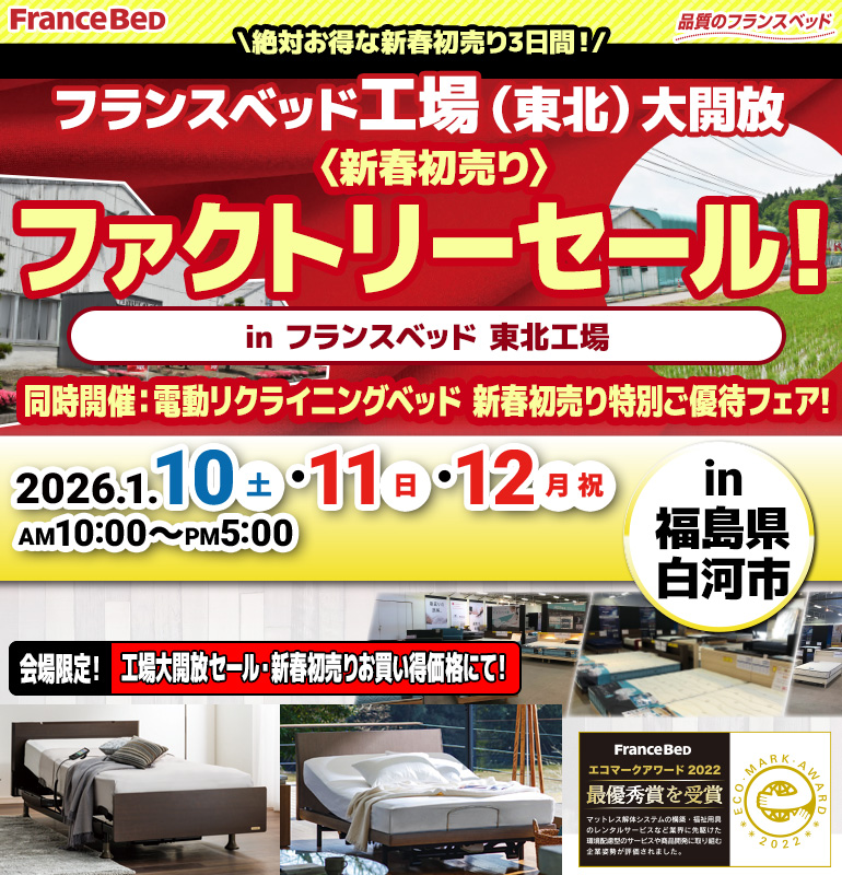 - 【絶対お得な新春初売り3日間!】 フランスベッド工場(東北) フランスベッド工場大開放<新春初売り>ファクトリーセール!