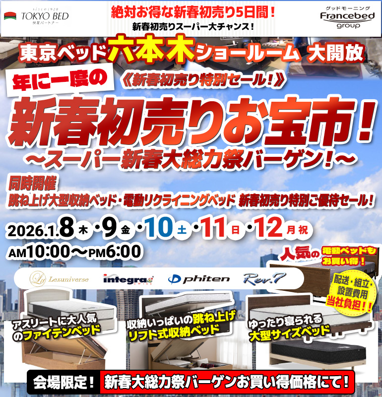 - <年に一度の> 東京ベッド六本木ショールーム 新春初売りお宝市!~スーパー新春大総力祭バーゲン!~