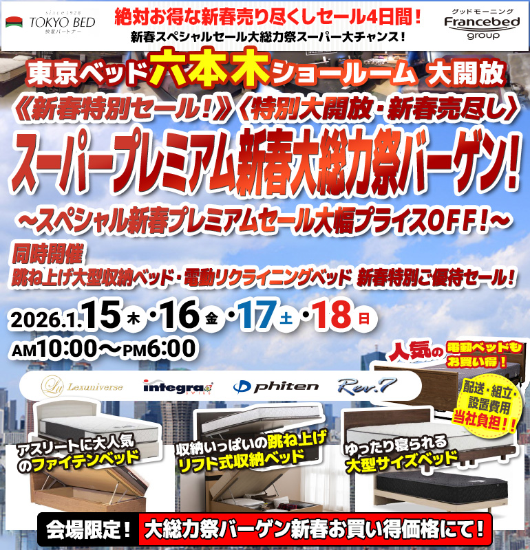 - 東京ベッド六本木ショールーム <特別大開放・新春売尽し>スーパープレミアム新春大総力祭バーゲン!