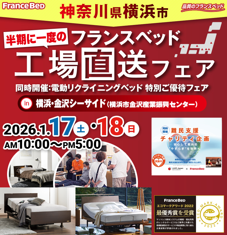 - <絶対お得な2日間!半期に一度の特別ご奉仕・工場直送価格の大チャンス!> フランスベッド工場直送フェア in横浜・金沢シーサイド